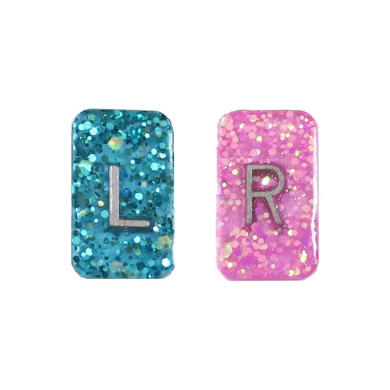 - X-RAY MARKERS: Set of two high quality X-Ray markers, made from smooth resin, measuring approximately 0.75 inch x 1.25 inch (20mm x 30 mm). The lead letters are about 1/2" tall. Color Coded: R-glitter Pink/ L-glitter Blue-Green, NO INITIALS.