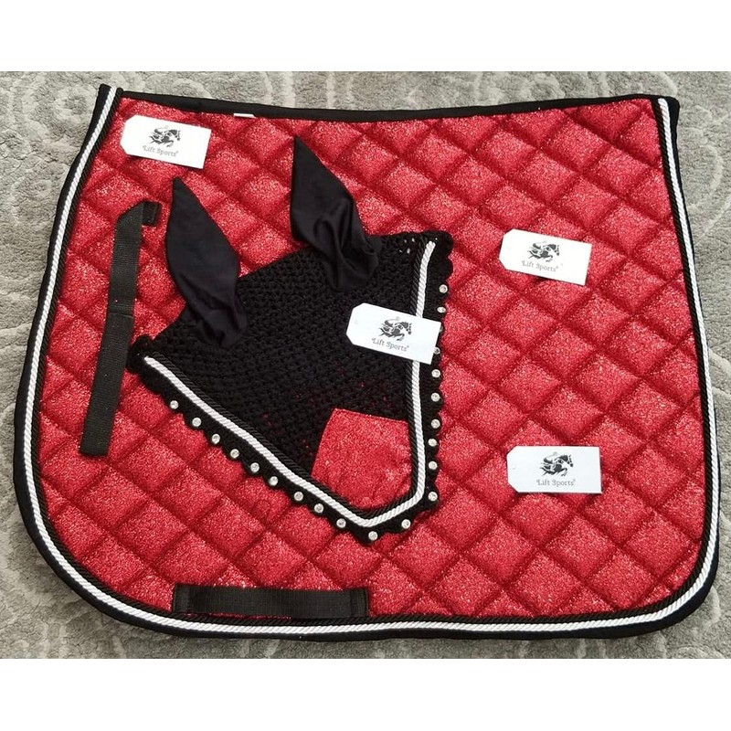 Glittery Shine Horse English Saddle Pad Set with Matching Fly Bonnet Set Ear Net Fly Veil (Golden)