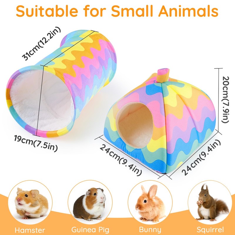 - 【Plus Size Hideout】The size of this guinea pig house is bigger than normal, length 9.4", height 7.9", width 9.4", tunnel size: length 12.2", diameter 7.5". This size is very suitable for adult guinea pigs, hamsters, chinchillas, dwarf rabbits and other small animals.