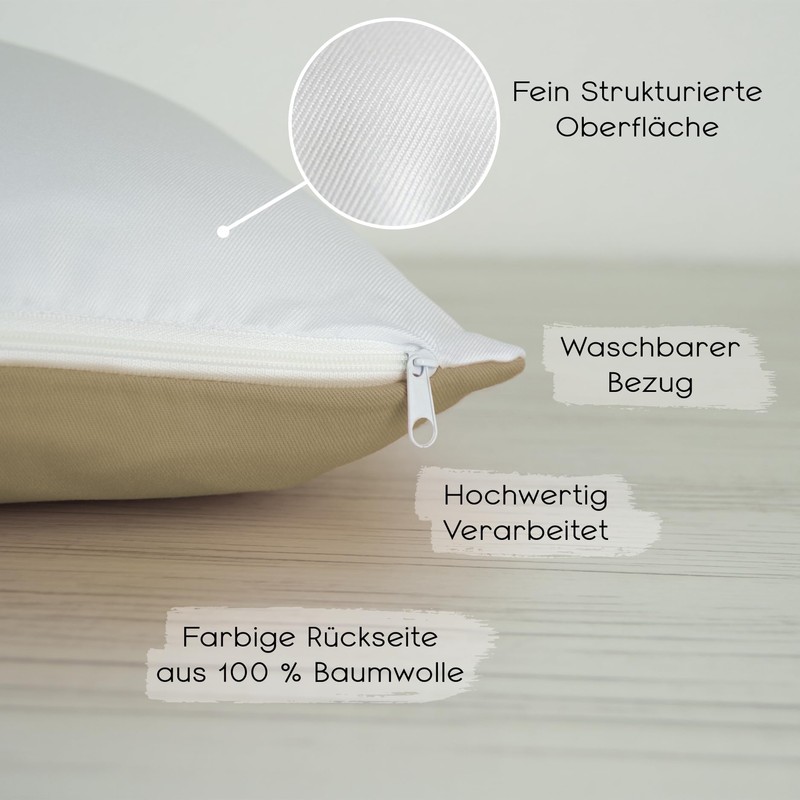 - High quality – high-quality cushion, front white with high-quality print, back coloured – available in 5 different vibrant colours. Printed with love in Germany