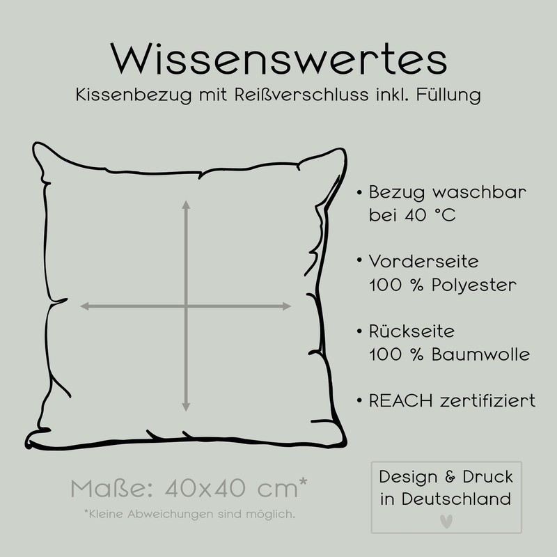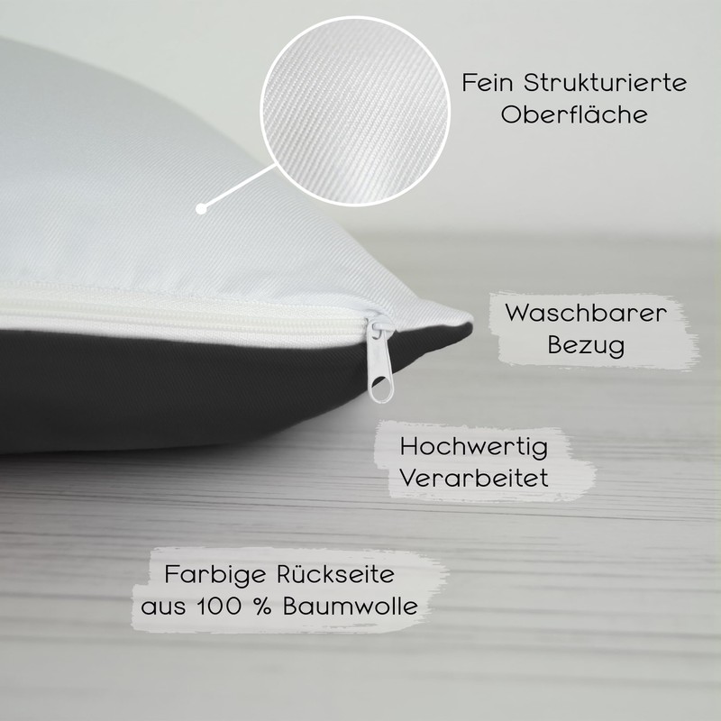 - High quality – high-quality cushion, front white with high-quality print, back coloured – available in 5 different vibrant colours. Printed with love in Germany