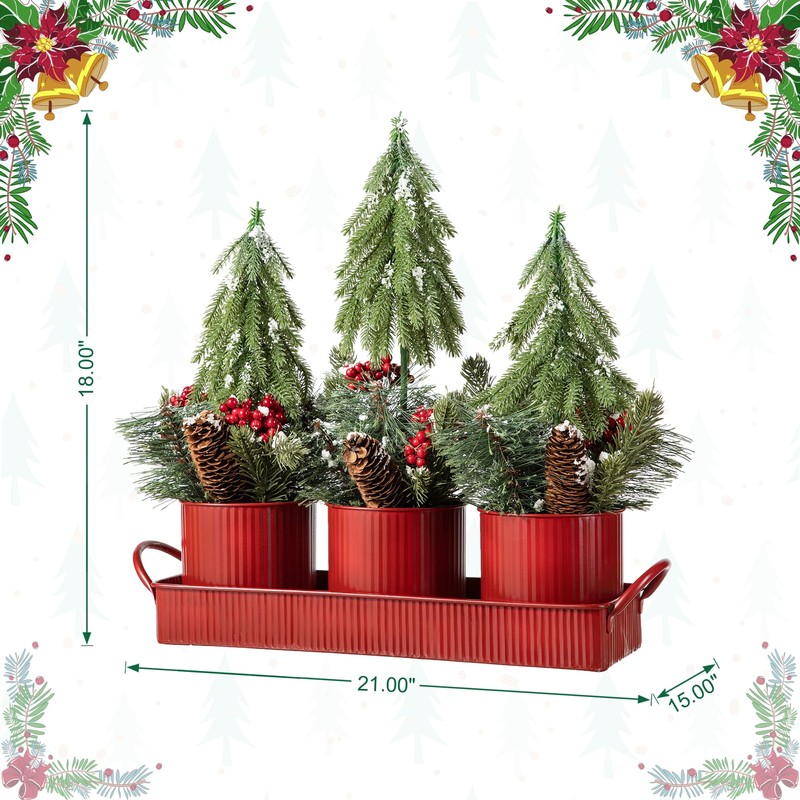 - Elegant Red Metal Pots: Each tree is individually potted in a stylish red metal pot, arranged on a coordinated tray, adding a touch of elegance and uniqueness to your holiday display.