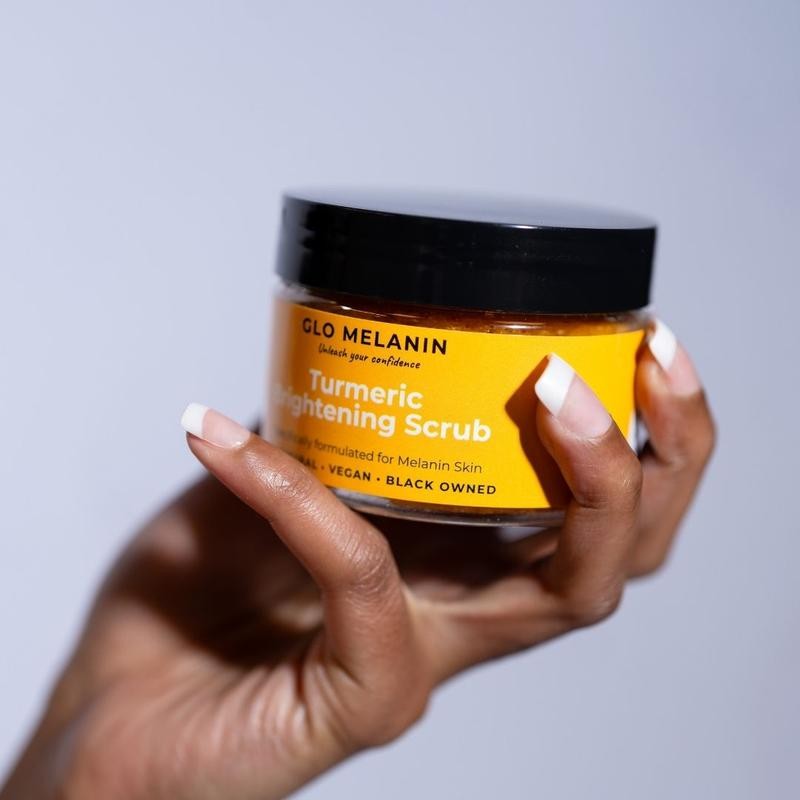 - Glo Melanin Turmeric Brightening Scrub for Hyperpigmentation and Exfoliation, w/ Sea Salt & Vitamin E, 200ml