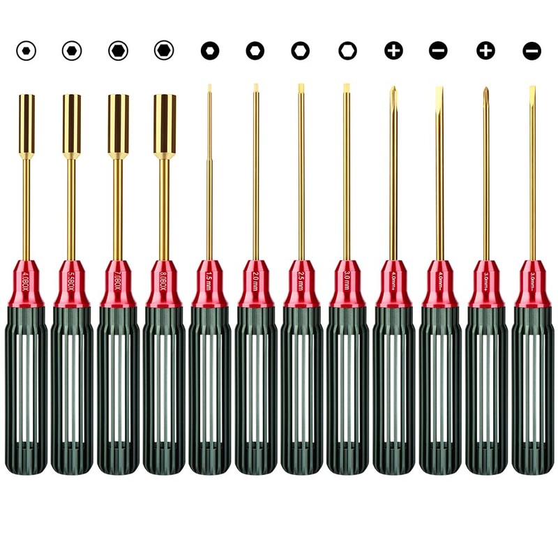 - 【12Pcs RC Tool Bag】 RC hobby tools including RC hex screwdriver set (1.5mm 2.0mm 2.5mm 3.0mm), RC Hex nut Driver Set (4.0mm 5.5mm 7.0mm 8.0mm), Phillips driver (3.0mm 4.0mm), slot drivers (3.0mm 4.0mm).