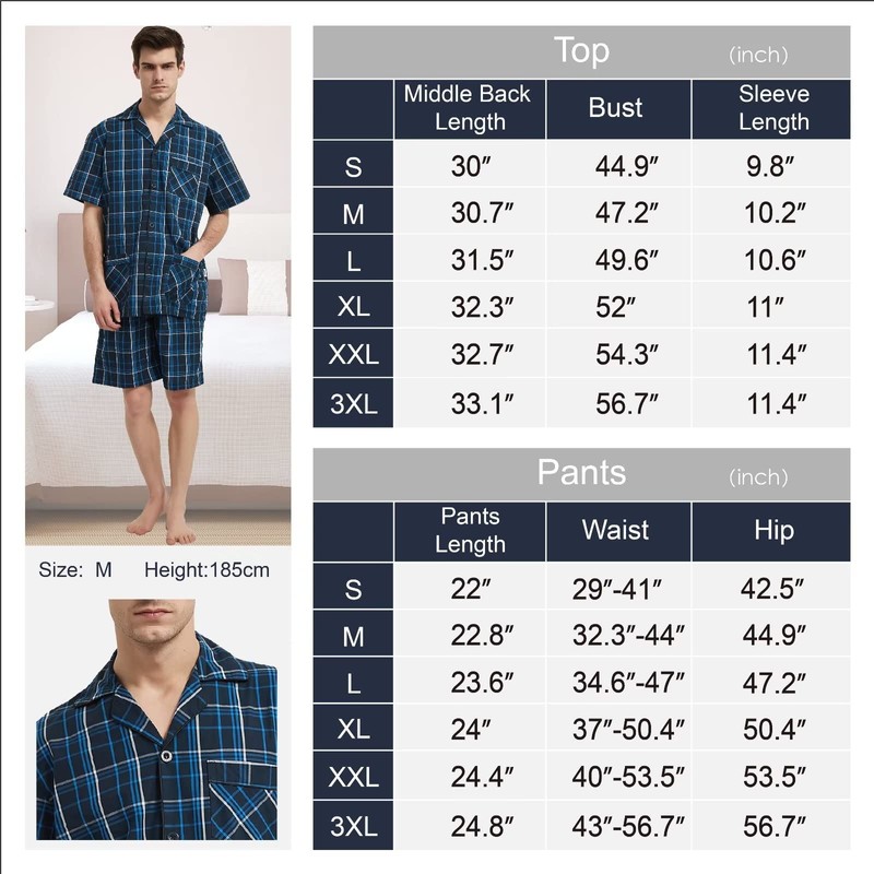 • · Pantalones cortos con cordón: las bandas elásticas con cordón evitan que los pantalones se ajusten alrededor de la cintura y se pueden ajustar según sea necesario para mayor comodidad. Todos los pijamas de algodón para hombre son de calidad garantizada y siempre se eligen como regalo para marido, padre y amigos.