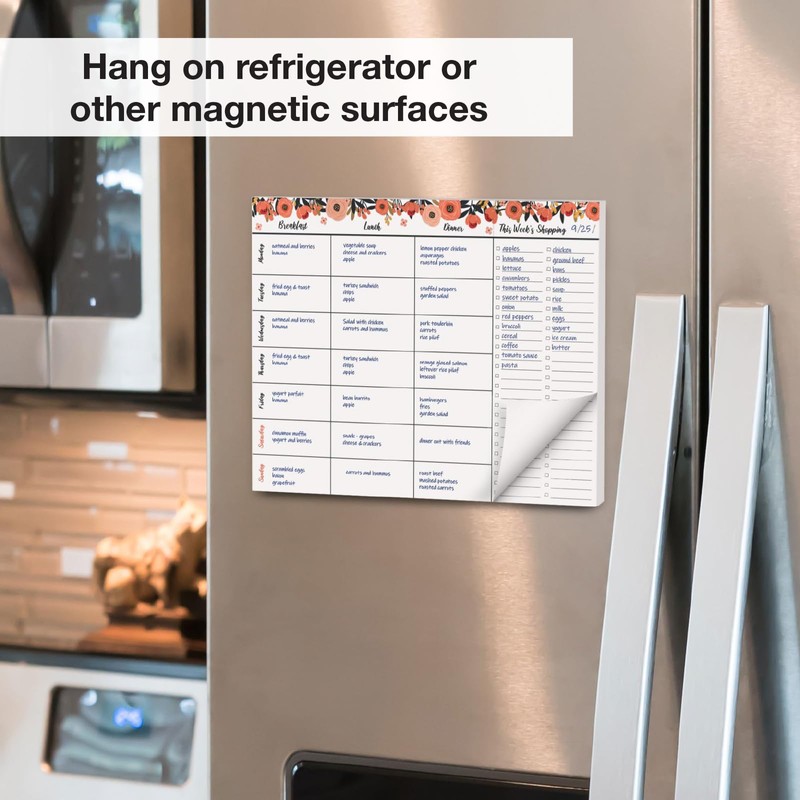 - MAGNETIC CONVENIENCE - Equipped with rear magnets, this Meal Planning Pad effortlessly adheres to any magnetic surface such as refrigerators or kitchen boards. Keep your meal plans visible, your shopping lists organized, and your kitchen in order, making cooking and meal prep an enjoyable experience.