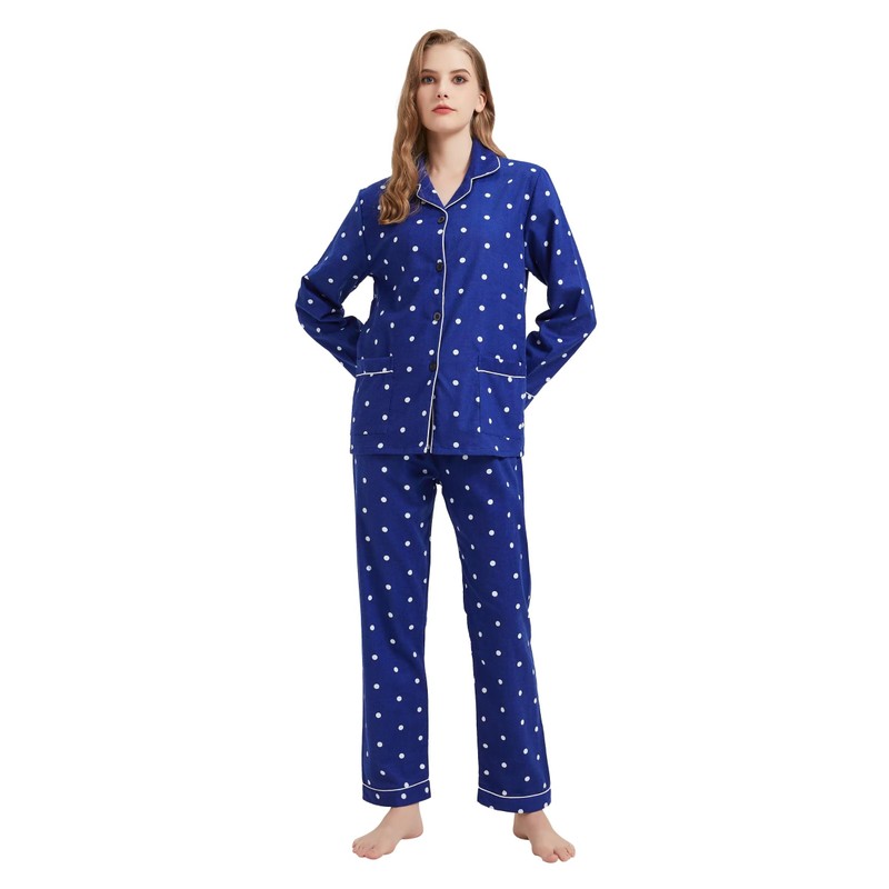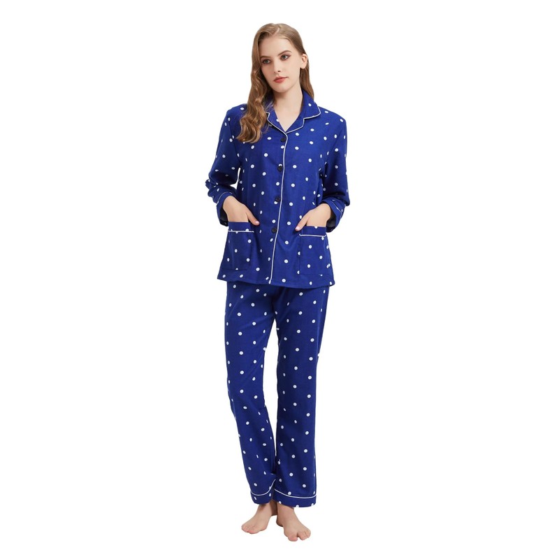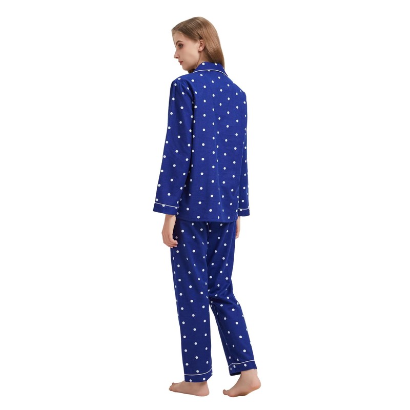 GLOBAL Pyjamas for Women Flannel Cotton Sleepwear long Ladies Pyjamas Sets Button Down Loungewear Blue, White Dots L