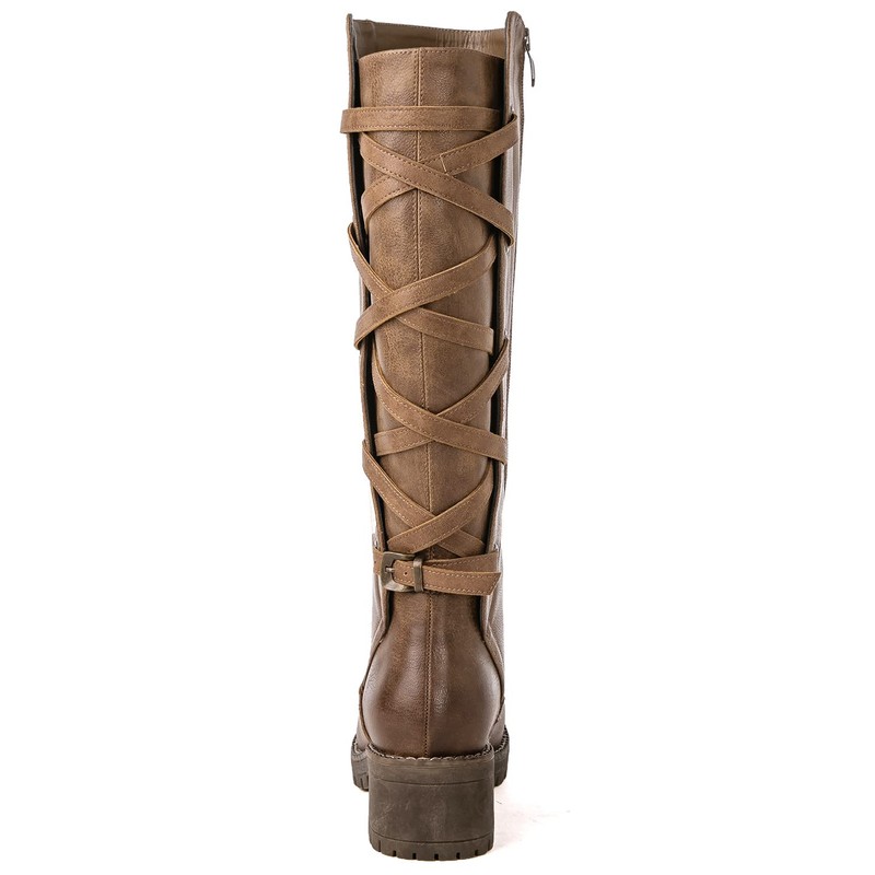 GLOBALWIN Women's Strappy Motorcycle Knee High Boots, Wide Calf Riding Boots Back Lace Up Fall Winter Fashion Knee High Boots For Women Brown 8M