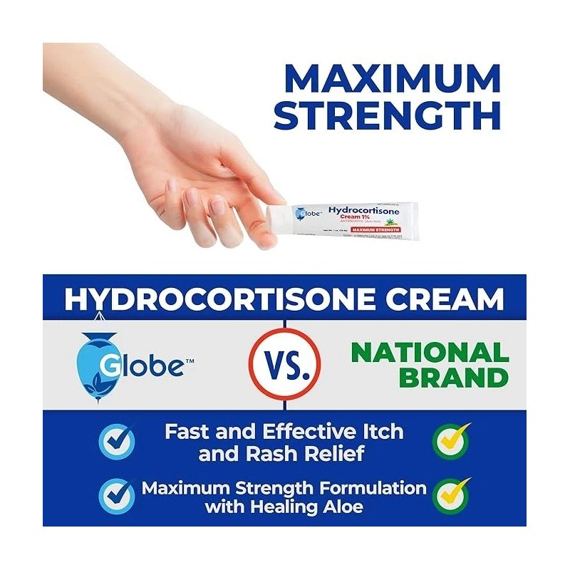 - MAXIMUM STRENGTH FORMULA: Globe Hydrocortisone Cream 1% with Aloe combines powerful hydrocortisone with soothing aloe for rapid relief from itching, redness, and irritation. Ideal for eczema, psoriasis, insect bites, and more.