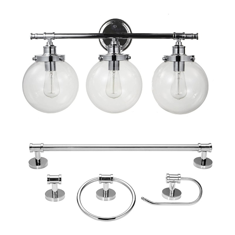 Globe Electric Milan 5-Piece All-in-One Bathroom Set, Chrome, 3-Light Vanity Light with Clear Glass Shades, Towel Bar, Towel Ring, Robe Hook, Toilet Paper Holder