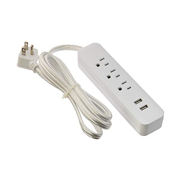 Fabric covered 16Ga cord features a power strip, right angle plug, two USB 3.1a ports and three grounded outlets. Designed to deliver 300 joules of surge protection. Product is available in white/silver and measures 6'.