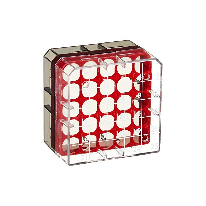 Globe Scientific BioBox 3039R Polycarbonate Storage Box with Transparent Lid for 1mL and 2mL Tubes, Holds 25 Vials, Red (Pack of 8)
