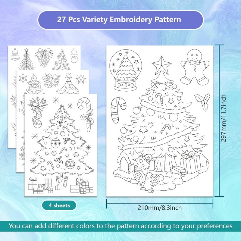 - Package: This set includes 4 sheets of 210x297mm/8.3x11.7-inch water-soluble embroidery stabilizers, 27 pieces of Christmas themed patterns. Designs such as Christmas trees, gifts, cookie makers, bells, etc. are artistic and exquisite in appearance.