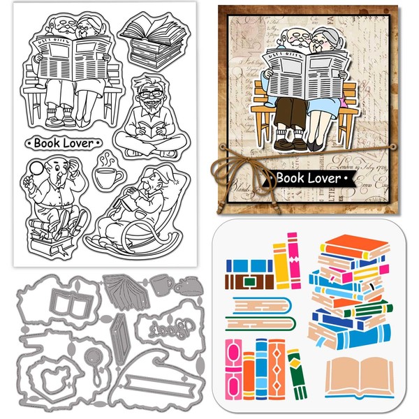 - Verpackung enthält:Dieses Paket enthält 1 Bogen Silikonklarstempel, 1 Satz Stanzformen aus Metall, und 1 PC passendes Malerei-Schablonen-Set mit alten Mann, der liest, einschließlich Muster, altes Ehepaar, Buch, Kaffee, Leseliebhaber, und mehr.