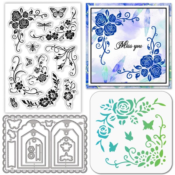GLOBLELAND Blumen Ecke Stempel and Cutting Dies Set for Card Making Schmetterling Biene Stamps and Stencils Flourish Ecke Embossing Stencil for DIY Scrapbooking Crafts Album Accessories
