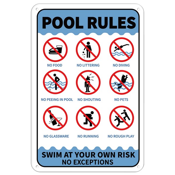 - HEAVY DUTY ALUMINUM MATERIAL: 8x12 inches high quality metal signs are made of 35 mil aluminum, with UV coating glossy finished. Waterproof and dustproof, the "Pool Rules - Swim at Your Own Risk"sign can last long years indoor or outdoor.