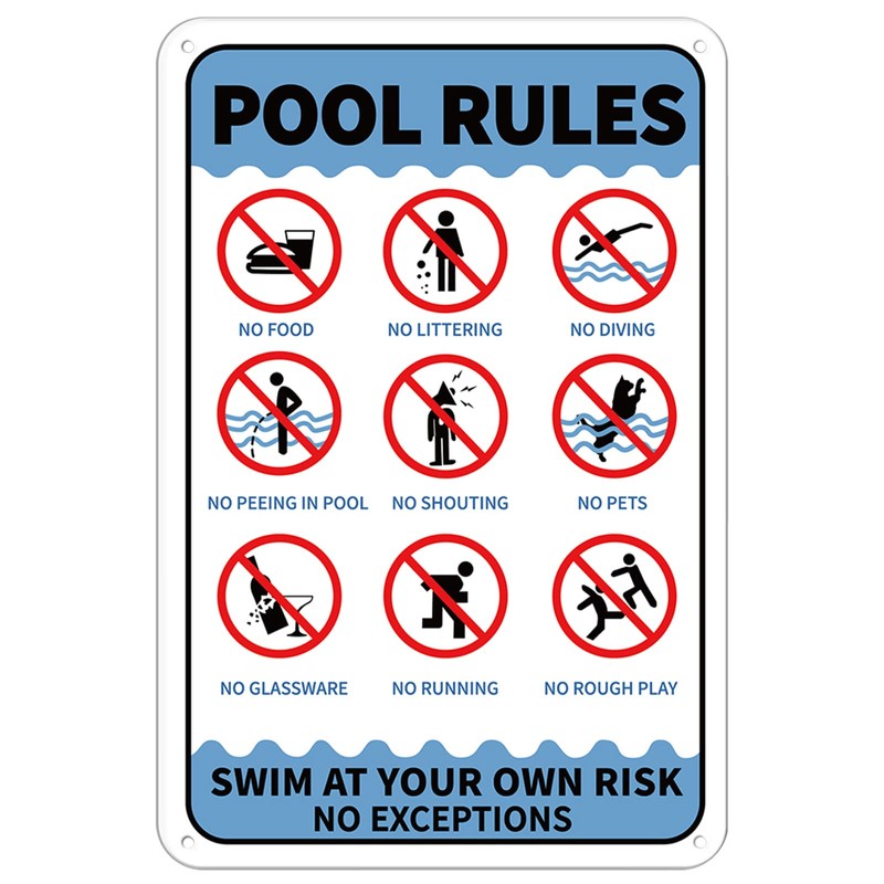 - CLEAR TO READ: "Pool Rules - Swim at Your Own Risk" Sign made by high quality printing and the letter are clear to read. Easy-to-understand pictures and bold red fonts can be used in swimming pools and beaches to remind swimmers.