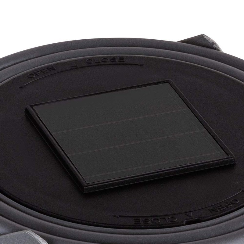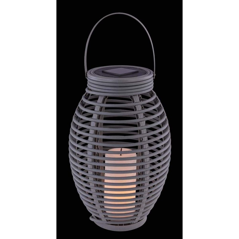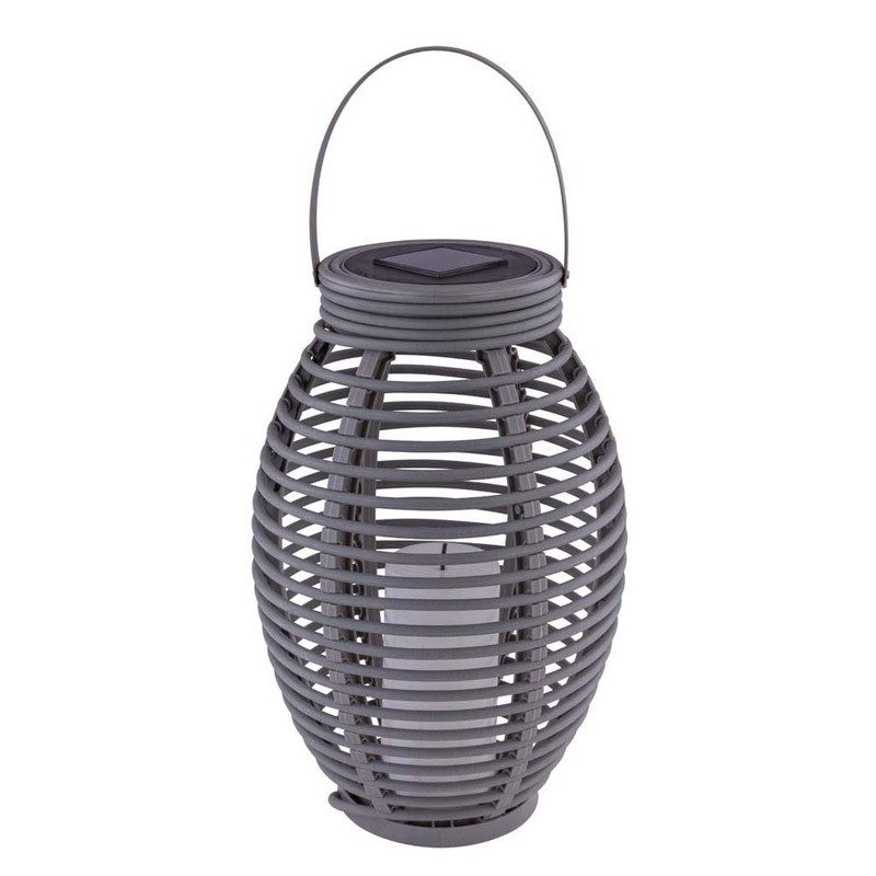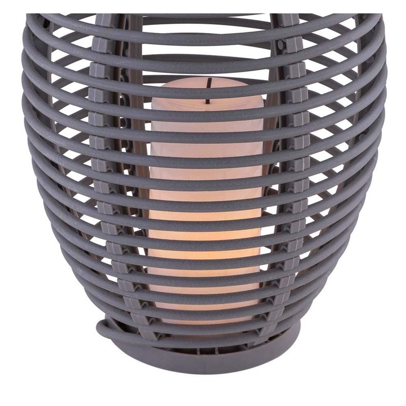 - The portable solar table lamp with hanging loop is made of grey plastic in rattan look.