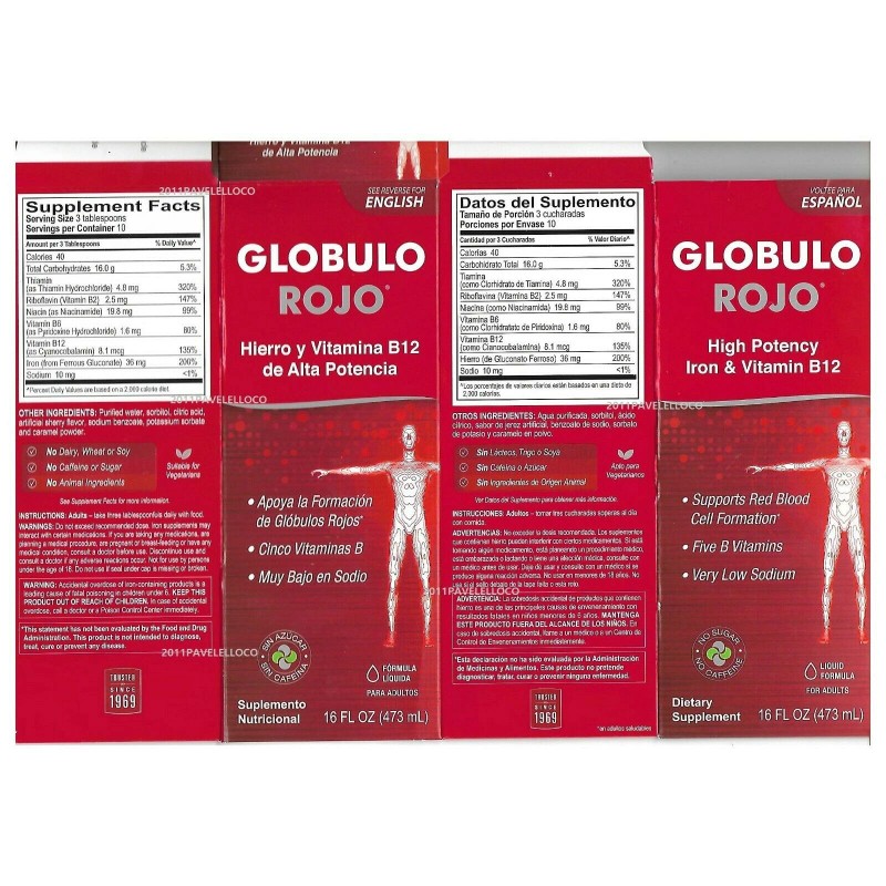 Globulo Rojo Liquid Dietary Supplement ,Hierro B12 Vitamins and Iron LOW SODIUM