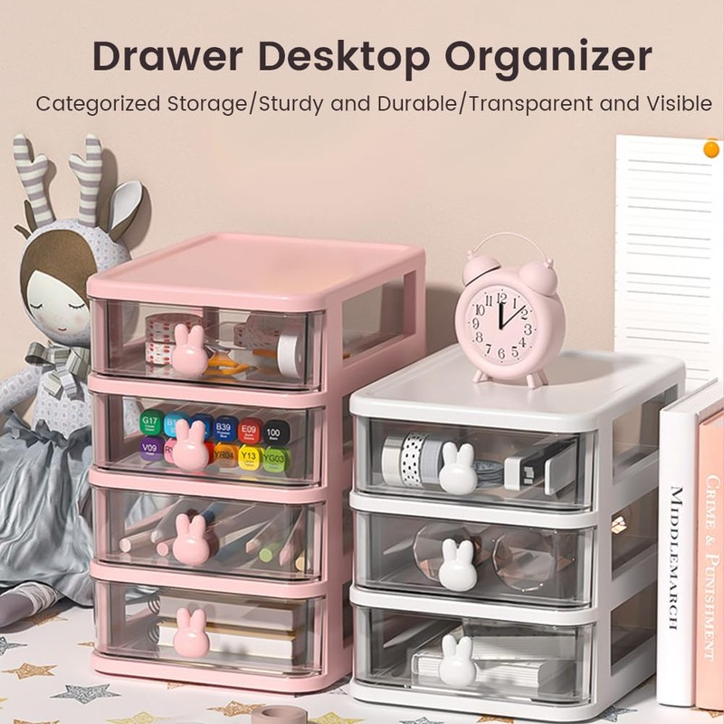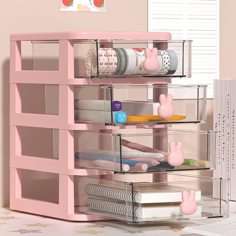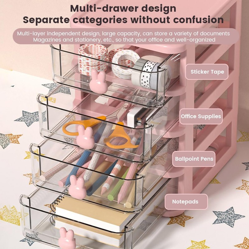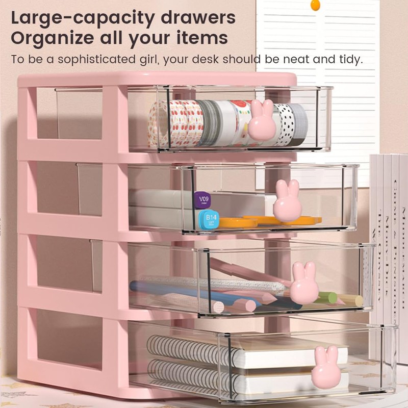 Glomora 4-Tier Desk Storage Box, Transparent Plastic Organizer with Bunny Handles, Large Capacity Multi-Level Drawer for Books, Pens, Office Supplies, Perfect for Home, Office, or Study