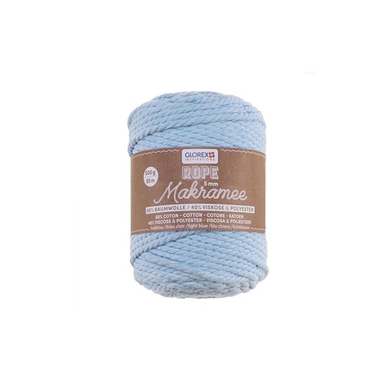 GLOREX 5 1007 23 - Macrame Rope 5 mm, 500 g, Light Blue, Length 85 m, Super Soft Textile Yarn Made of 60% Cotton, 40% Viscose, for Crocheting, Knitting, Knotting and Textile Designing