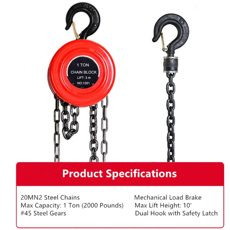 • SPECIFICATIONS - glorousamc compact manual hand lift chain block hoist is made of premium alloy steel with a capacity of up to 1 Ton / 2,000 lbs.; Chains are made from 20MN2 steel for added strength that you can depend on for heavy lifting jobs.Entire hoist is crafted with heavy duty steel that ensures ultimate durability.