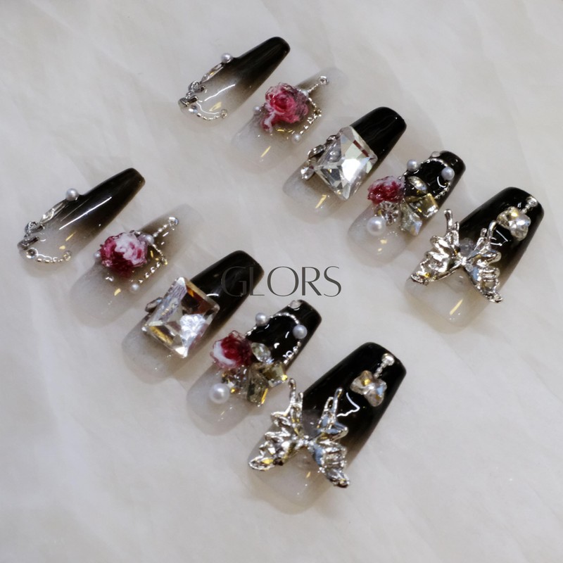 GLORS Handmade Press On Nails, Long Coffin Style, Black with 3D Butterfly and Rose Design, 10 Pieces (XS,LC)