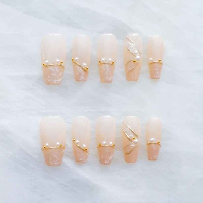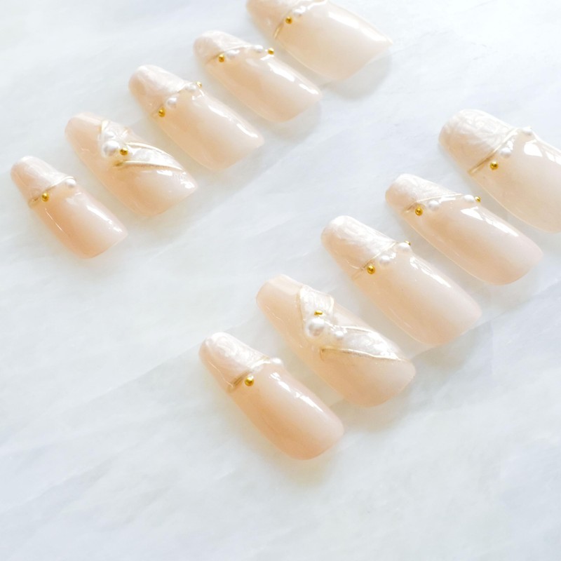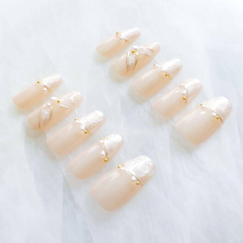 - LUXURY DESIGN: Elegant pearl-effect press-on nails featuring a sophisticated ballerina shape with delicate gold accents for a high-end manicured look