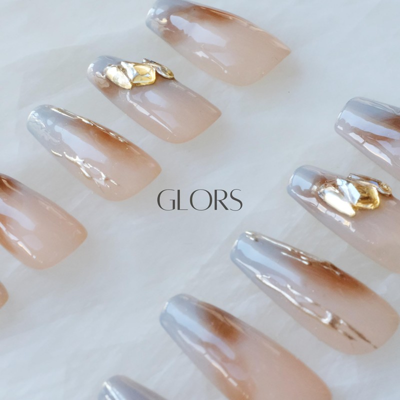 GLORS Ombre Press On Nails, Long Ballerina Style, Nude to Gray with Gold Accent, 10 Pieces (M,LB)
