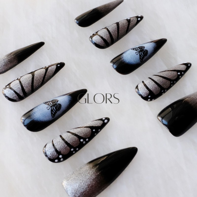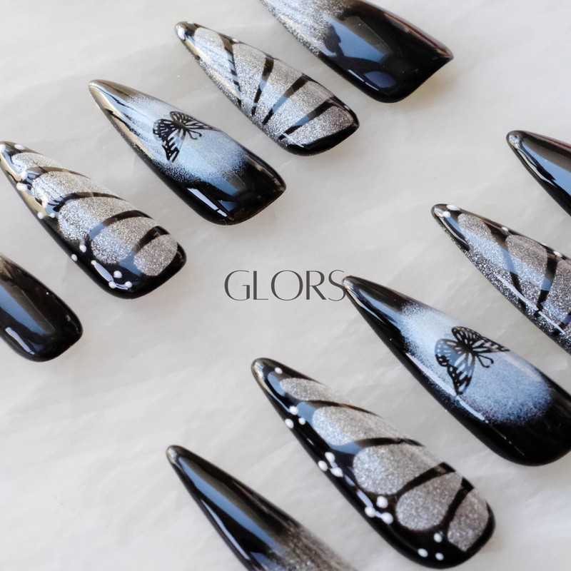 [GLORS] Stiletto Press-On Nails, Black and Silver Butterfly Design, 10 Pieces (XS, LS)