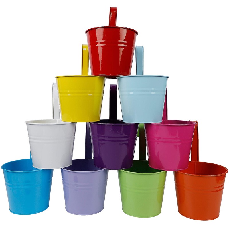 - Package Size: 10 pack metal iron hanging pots. Diameter 6.3, bottom diameter 4.7", height 5.2", plus hook 5". The hook and bucket are detachable, you need to install the iron barrel when you get.