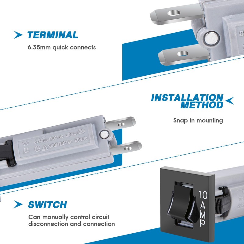 • Replace Slow blow glass cartridge fuse; Snap in mounting, 0.250" (6.3) QC terminals;