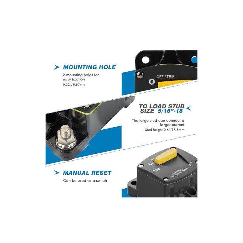 - [Waterproof] - The circuit breaker housing has an IP67 waterproof rating, which is practical and durable. Very suitable for use in harsh environments. Marine circuit breakers can be installed on panels or firewalls.