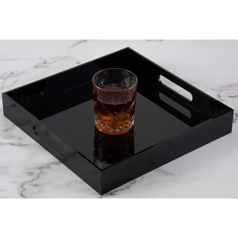 Glossy Black Sturdy Acrylic Serving Tray with Handles-12x12Inch-Serving Coffee,Appetizer,Breakfast,Butler-Kitchen Countertop Tray-Makeup Drawer Organizer-Vanity Table Tray-Ottoman Tray-Decorative Tray
