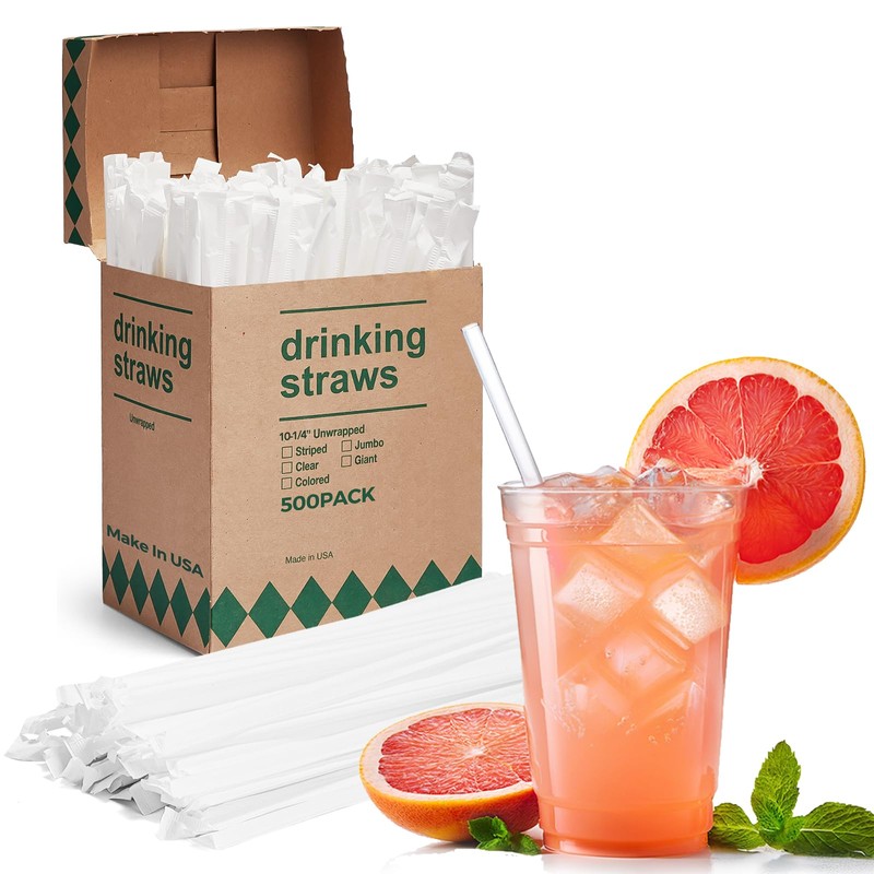 - Quantity & Packaging: 500 clear disposable plastic straws. Each straw is individually wrapped in a paper sleeve to ensure maximum sanitation, and the sleeves are easy to remove