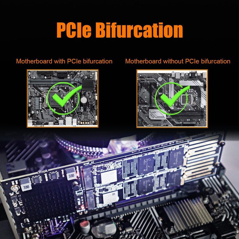 - With pcie splitter function in this host adapter (ASMedia ASM2812 chip), so PCIe Bifurcation function is not required for your motherboard. That means all most of motherboards can work with this Dual M.2 PCIe SSD Host Adapter