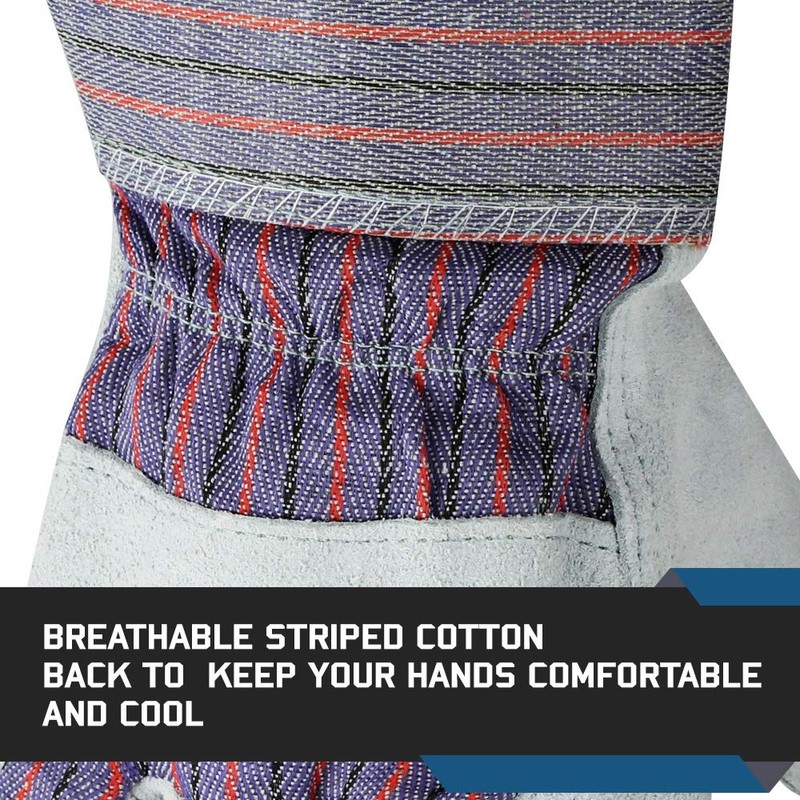 • Enhanced Comfort & Protection – Leather knuckle strap for impact resistance and a breathable striped cotton back to keep hands cool.