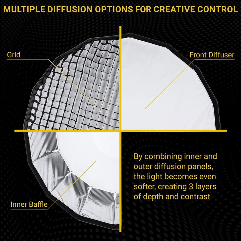 • EZ Lock 48" Deep Parabolic Softbox - External Diffuser - Internal Diffuser - Eggcrate Grid - Bowens Mount Speedring Adapter (Insert Size 150mm) - Reversible Deflection Cap Disk - Storage Bag