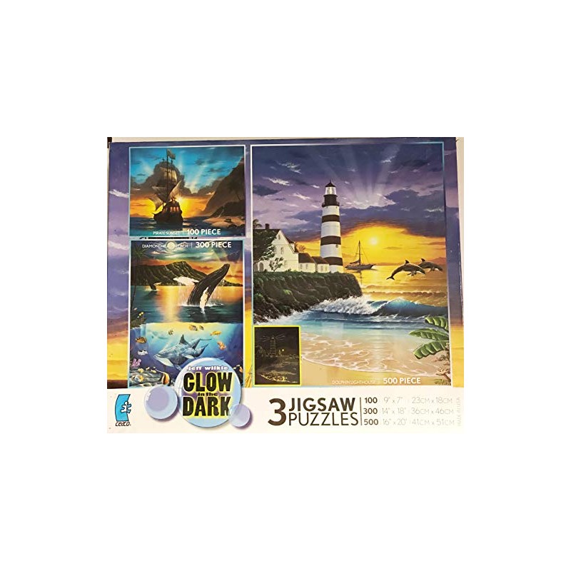 3 Jeff Wilkie Glow in the Dark Jigsaw Features art work of Jeff Wilkie -"PIRATE SUNSET" (100 Piece Puzzle, size 9" X 7") , DIAMONDHEAD BREACH" (300 Piece Puzzle, size 14" X 18") and "DOLPHIN LIGHTHOUSE" (500 Piece Puzzle, size 16" X 20").