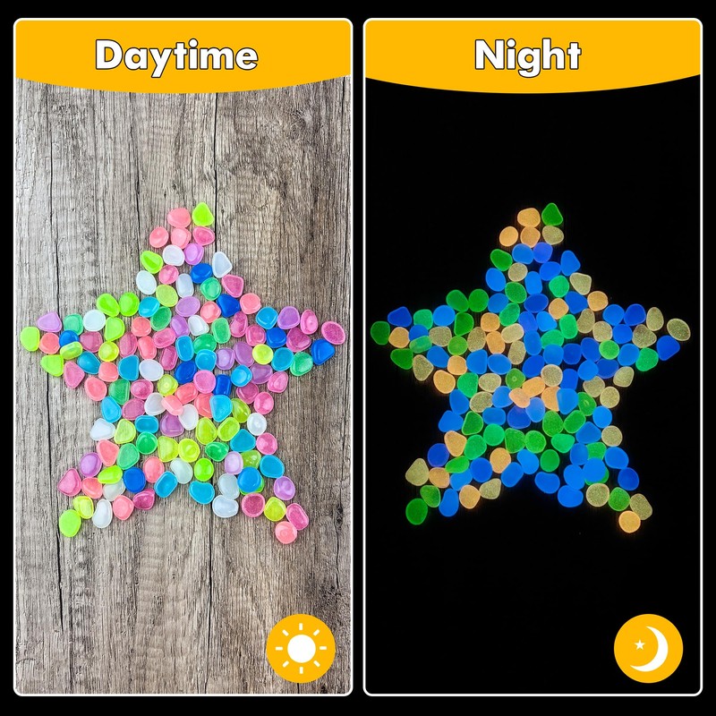 - How It Works: Absorb Light - Expose the glow in dark rocks to direct sunlight or indoor lighting for 1-2 hours. Glow at Night - Once the lights are off, the glowing pebbles will automatically emit a soft, magical glow. **Kind Reminder:** For outdoor use, ensure there are no obstructions so the luminous stones can absorb sufficient light for optimal glow.