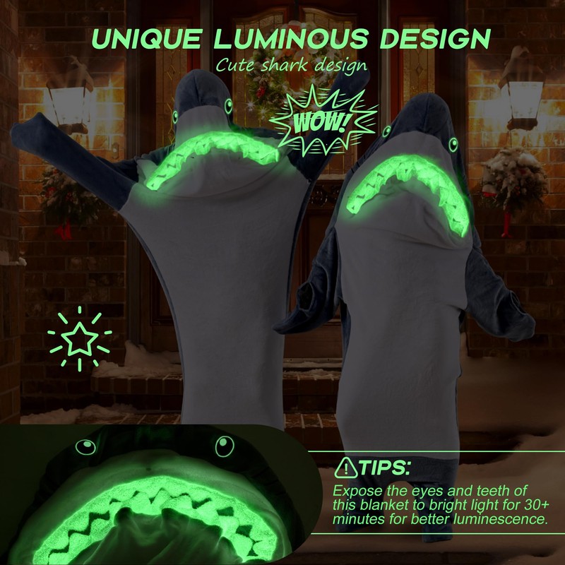 Glow in The Dark Shark Blanket for Adult, Shark Costume with Shiny Eyes and Teeth, Shark Onesie as Gift for Lover, Shark Hoodie for girls, Shark Sleeping Bag, Wearable Shark Blanket for Party