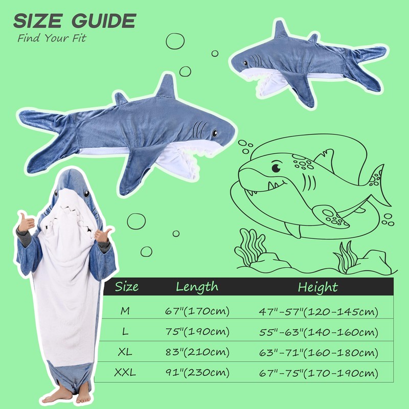 - Size & Customer Service: Our shark blanket is available in various sizes to ensure a perfect fit for different body types. Its design emphasizes a snug and cozy fit around the wearer's body, creating a secure and comforting experience. This blanket primarily covers the legs and lower body while leaving the upper body free for freedom of movement and comfort. If you have any question about our product, please feel free to contact us. Our team is here to answer your questions.