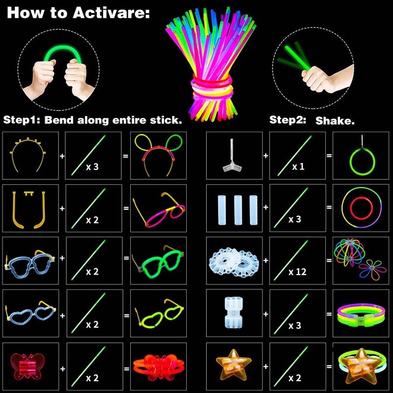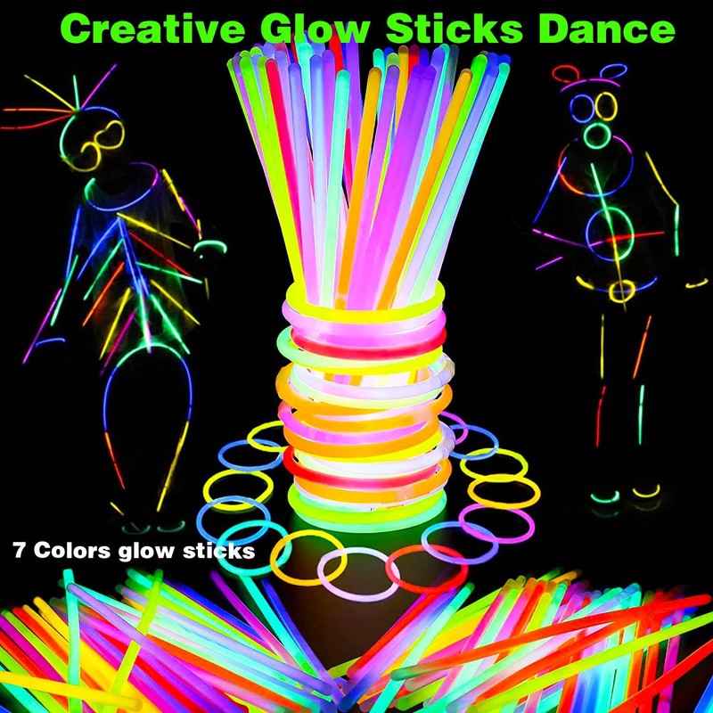 - ⭐【Easy to Use】Grab both ends of the glow stick and bend the stick with your thumbs, after bending it will appear a fluorescent effect. Shake it to make the fluorescent more uniform. Our glowing party supplies includes premium quality connectors that allow you to get creative by creating bracelets, necklaces, hats, eyeglasses, headband, balls, flowers, and other unique glowing designs.