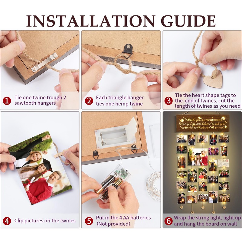 - LIGHT-UP THE GRAD PICTURE FRAME: An extra 10ft LED string lights with twinkle or firm lighting modes (Also Powered by 2 AA Batteries) is provided in this graduation photo holder. Put in batteries, wrap string lights around photos & board then switch on the button to light up the grad photo frame -all the precious memories will be bathed in warm & charming sparkling light, filled with joy & love, illuminate the path for every graduate to a bright future and give them hope, courage & strength.
