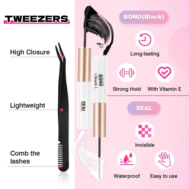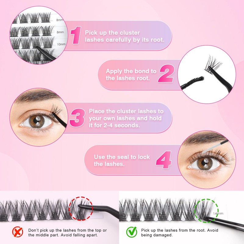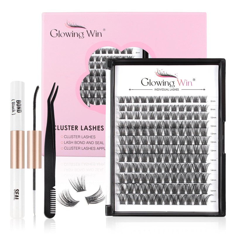 • 【Cluster Lashes Kit】: Glowingwin lash extension kit with lash bond&seal and applicator (tweezers), Mix 8-16mm( 8mm*2, 10mm*2, 12mm*3, 14mm*3, 16mm*2). 144pcs cluster lashes. Soft, cruelty-free, lightweight and reusable.