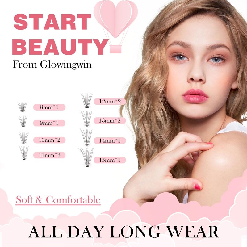 - 【Specification】: Glowingwin individual lashes extensions, 0.07C Curl, 10D, 8-15mm( 8mm*1, 9mm*1, 10mm*2, 11mm*2, 12mm*2, 13mm*2, 14mm*1, 15mm*1). 228pcs cluster lashes(12 rows, 19pcs per row). Soft, cruelty-free, lightweight and reusable.