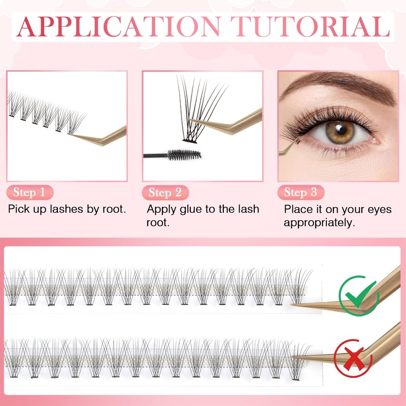 - 【 DIY Cluster Lashes, Enjoy It】: DIY eyelash extensions at home with lash glue, create your perfect daily look, which will make you more charming, gorgeous and confident, just enjoy it, Save Money! Cluster eyelashes take less time to apply, Save Time!