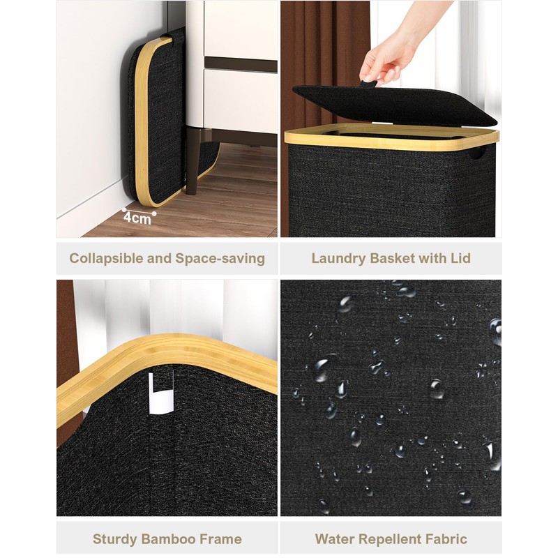 GLOWPOINT 105L Laundry Basket with Lid, Clothes Hampers for Laundry with Bamboo Handles and A Removable Laundry Bag, Washing Basket, Laundry Bin, Laundry Bag, Laundry Closet Sorter, Black