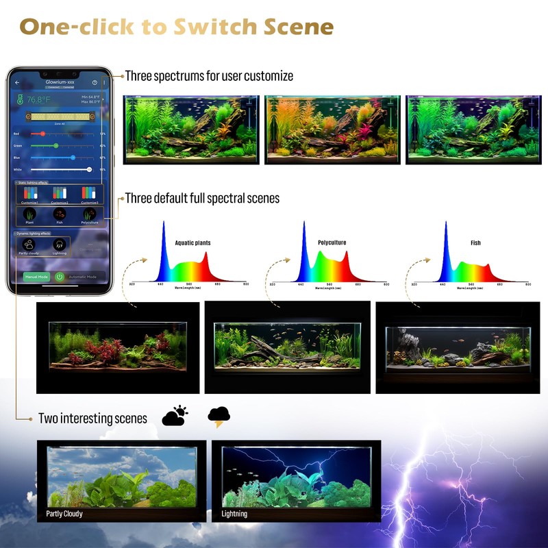 - 【DIY Spectrum and Brightness】4-channels RGBW light, 0-100% brightness adjustment. You can simulate natural light or create a unique light effect for your fish tank, to simulate the natural sunlight and moonlight cycle effect, and let your fish and plant grwo in an environment close to natural habitats.