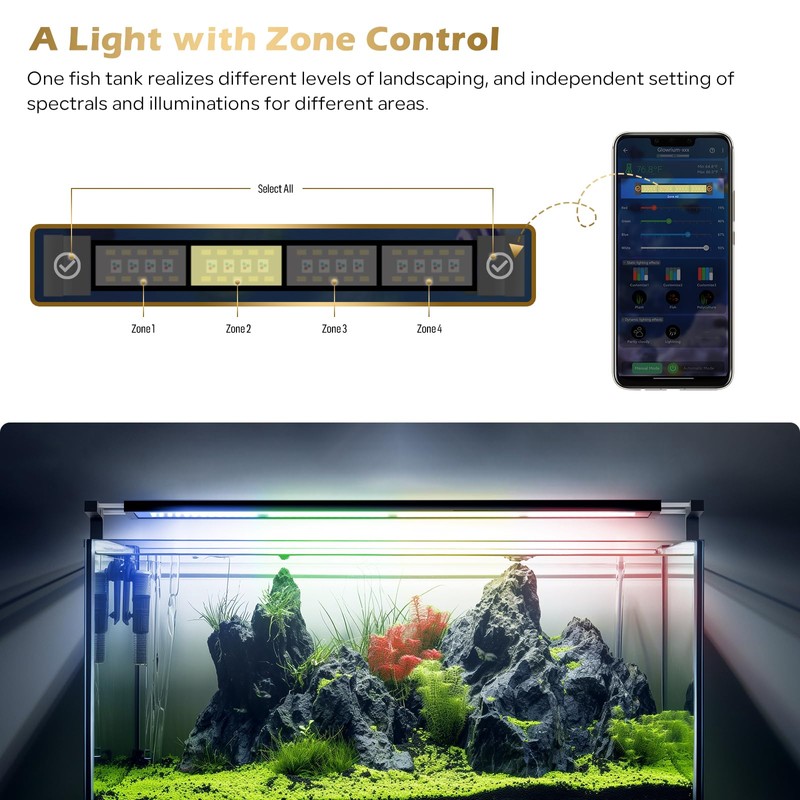 - 【Smart Zone control】Aquarium light with smart zone control focuses on innovation and flexibility. It has intelligent partition control function, this ensures that your aquatic plants and fish get the best lighting and health. Note: 15W and 23W have no partition control functions as the length limited. Par> 50 at the maximum power.
